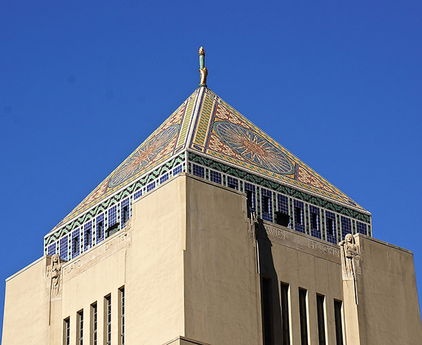 What follows is a brief guide to the art and architecture of the Central Library created by library docents Kenon Breazeale, Katy Go, and Sally Michaels. At the top of each page there are links to six chapters that provide more detailed information about aspects of the library’s art and architecture. Unless otherwise noted, all historic photographs are courtesy of the Los Angeles Public Library Photo Collection.