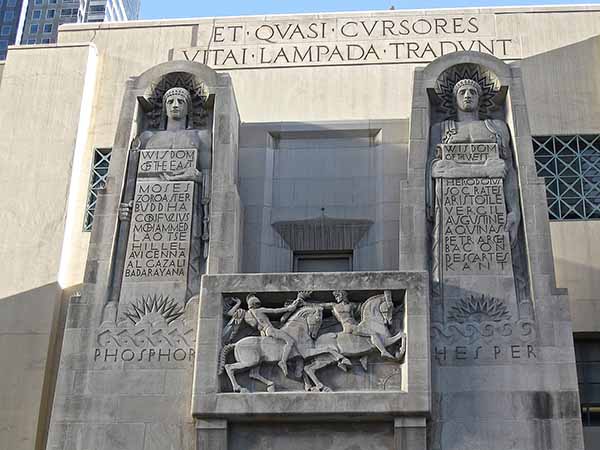 Lee Lawrie: Sculpture on Flower Street (west) facade of library, 1926