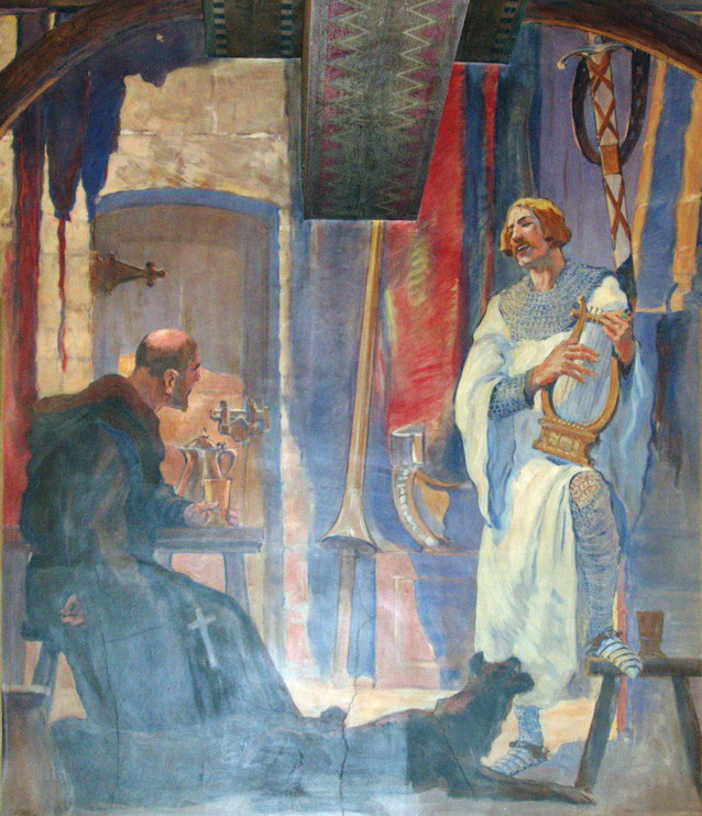 One more set of murals original to the Goodhue Building can be found adjacent to the International Languages Department in the Bradley Wing. They are located in what was formerly the Children’s Reading Room, the only portion of the east wing that escaped demolition during the 1986-93 renovation. Painted by Julian Garnsey and A.W. Parsons, the murals depict scenes from Walter Scott’s novel Ivanhoe and cover the entire upper wall surface of this relatively small room. The ceiling painted by Garnsey simulates old wooden beams and completes a castle-like environment meant to spark children’s imaginations.