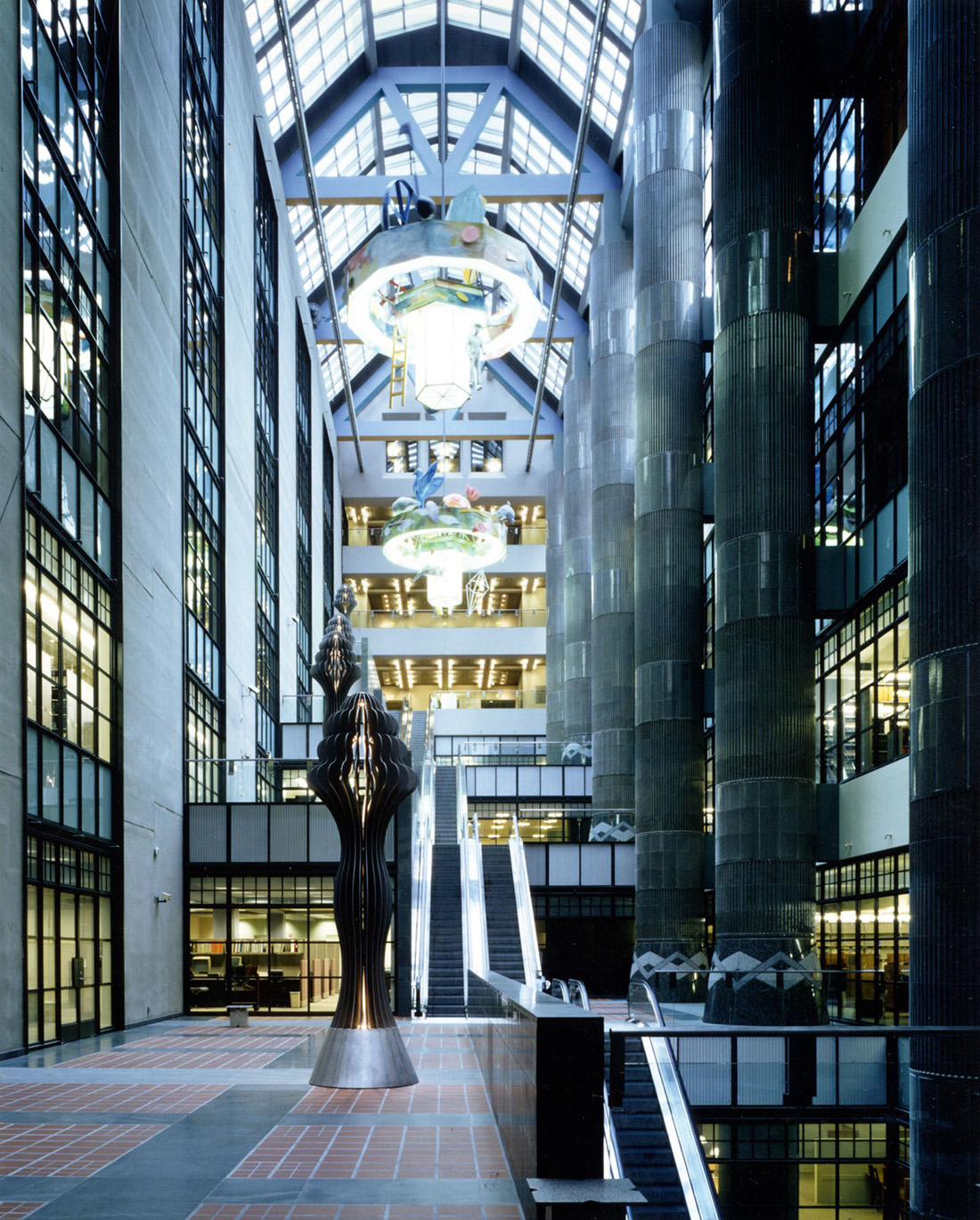 In the atrium two major artworks deal with light in ways both functional and metaphorical. Three massive chandeliers created by Therman Statom are suspended from the ceiling’s apex and dominate its upper space. Eighteen ft. in diameter and incorporating bright color applied in an expressive style, they symbolize the natural, technological and metaphysical spheres of existence.