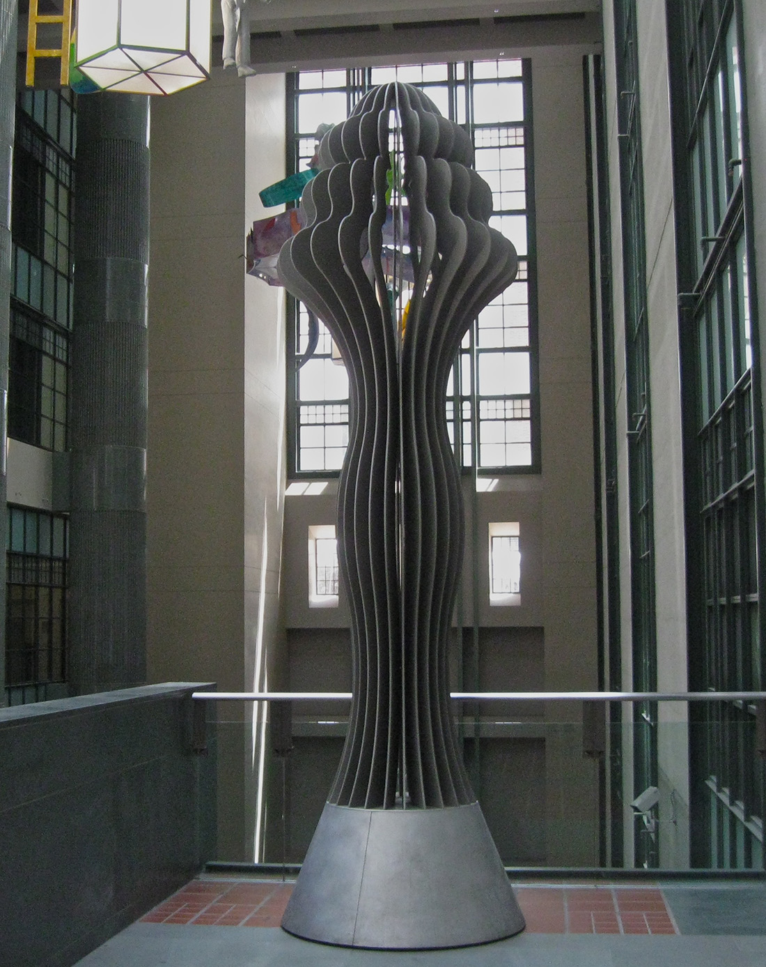 The other project, entitled Illuminations by Ann Preston, consists of four columnar light fixtures installed on the escalator landings at each level along the atrium’s inner wall. Standing thirteen feet high and constructed of radiating vanes of brushed aluminum, they contain small lights embedded in the base and top of each sculpted form.