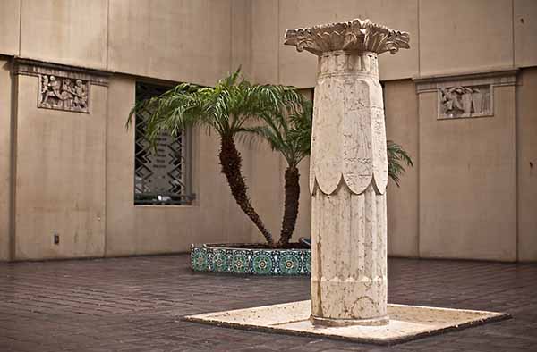 Two adjacent courtyards are located between the auditorium and the Goodhue Building. A ninety foot ornamental fence designed by metal artist Ries Niemi runs along the exterior of both courtyards providing a security barrier and also contributing variety and visual appeal to the Tom Bradley Wing’s lengthy north facade.