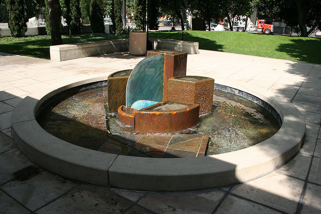 Directly across the garden sits another fountain created by Mineo Mizuno and Laddie John Dill. Composed of cement, glass and ceramic tiles, its multi-dimensional shape and earthy quality contrast with the more cerebral works by Fine and Halprin.