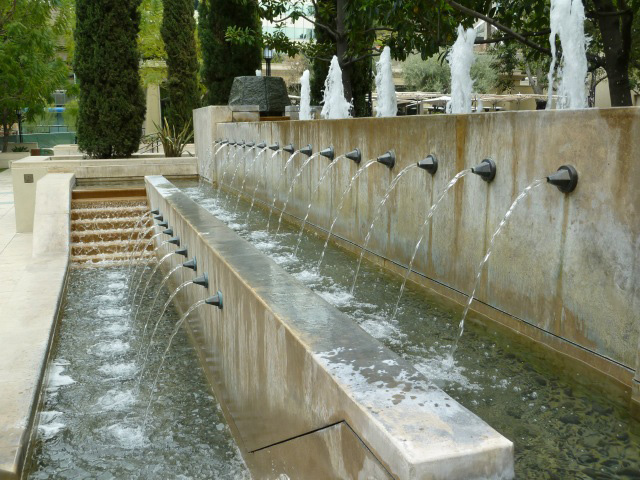 Cutting across the main east/west axis formed by Spine is a north/south alignment of two fountain areas. On the south side the Grotto, designed by Lawrence Halprin, is framed by two interconnected fountains with water bubbling and coursing through and over-elaborate architectonic surfaces.