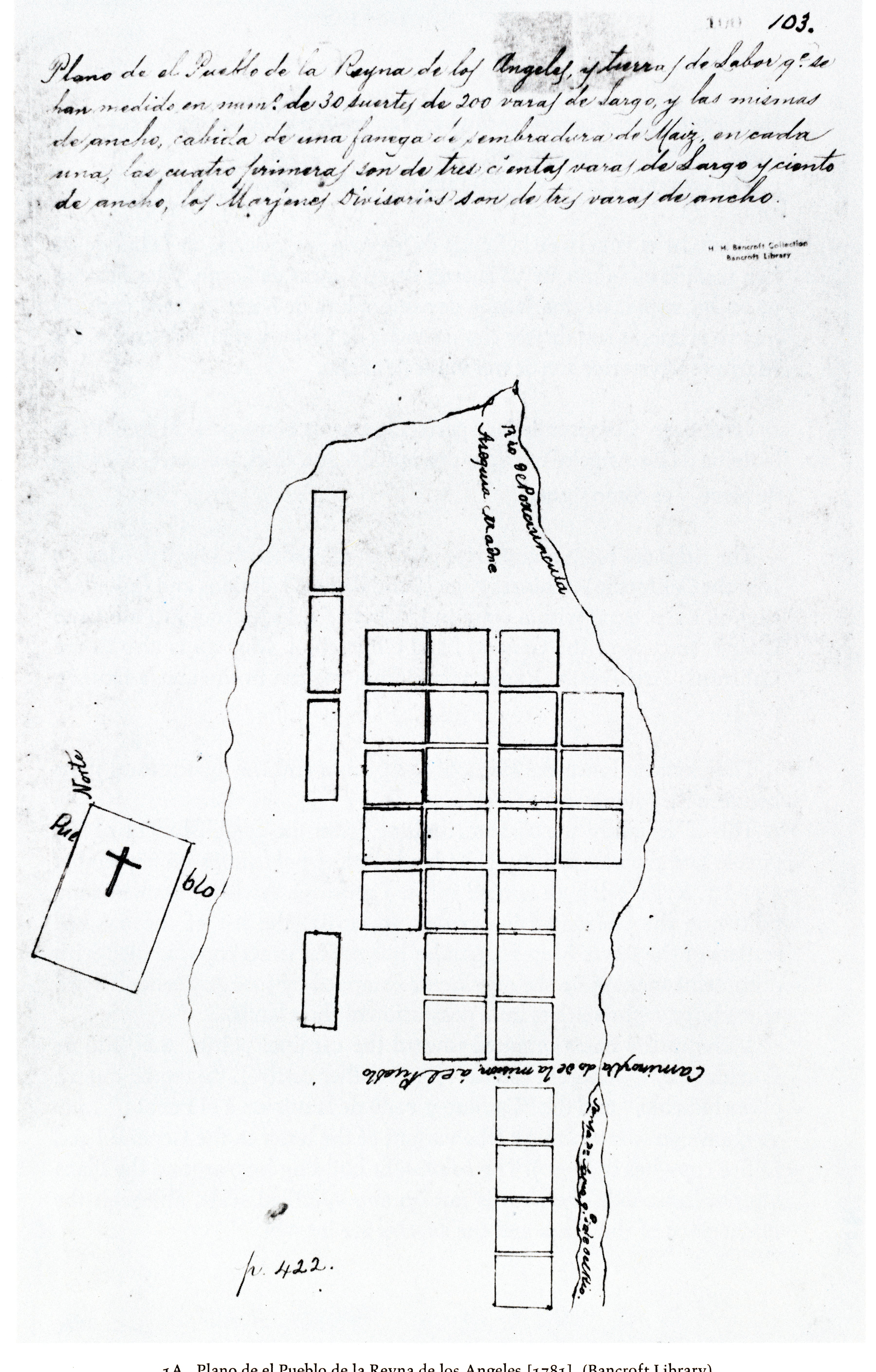 Plaza Cemetery - From a plan created by Jose Arguello laying out the original pueblo including the cemetery that served the settlement until they began transferring bodies to the city cemetery up in the hills above the plaza.