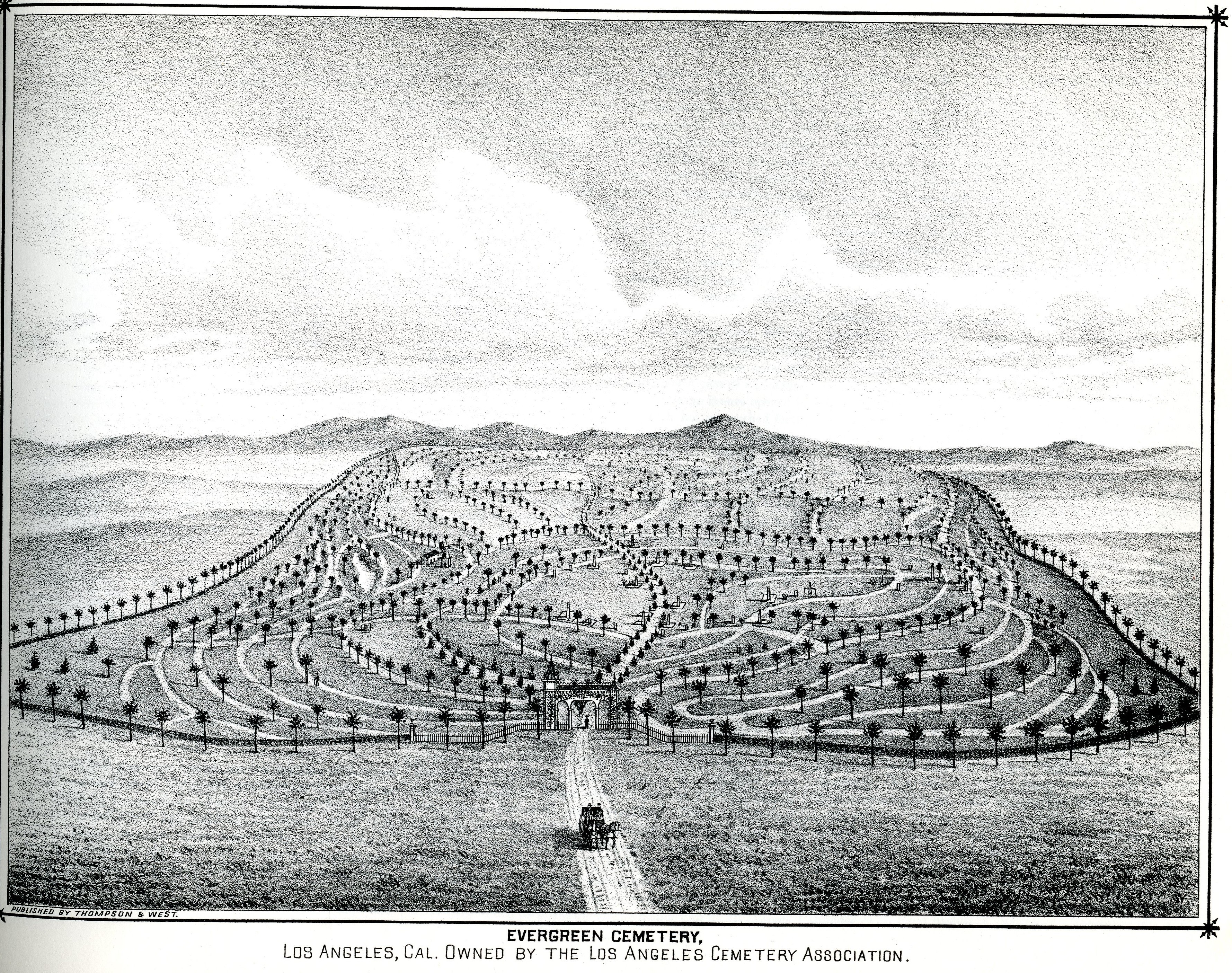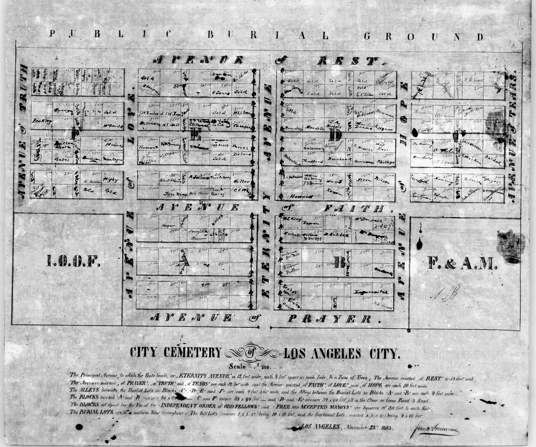 The planned plaza, shown below, already had burial plots laid out and the first public cemetery goes so far back the first man buried there was killed by a bear in the Santa Monica Mountains. The very first surveyed map of the city features two cemeteries and Eternity Street which needs little explanation. In the early days, cemeteries were not coop-style and it was up to the families to maintain and protect the graves which often fell away as the years passed, as did the relatives. Many bodies were moved from old cemeteries to new ones and some just got paved over as progress expanded the city of Los Angeles. Included here are some of the prominent cemeteries around the city with some excluded just because they don’t show up well on maps.