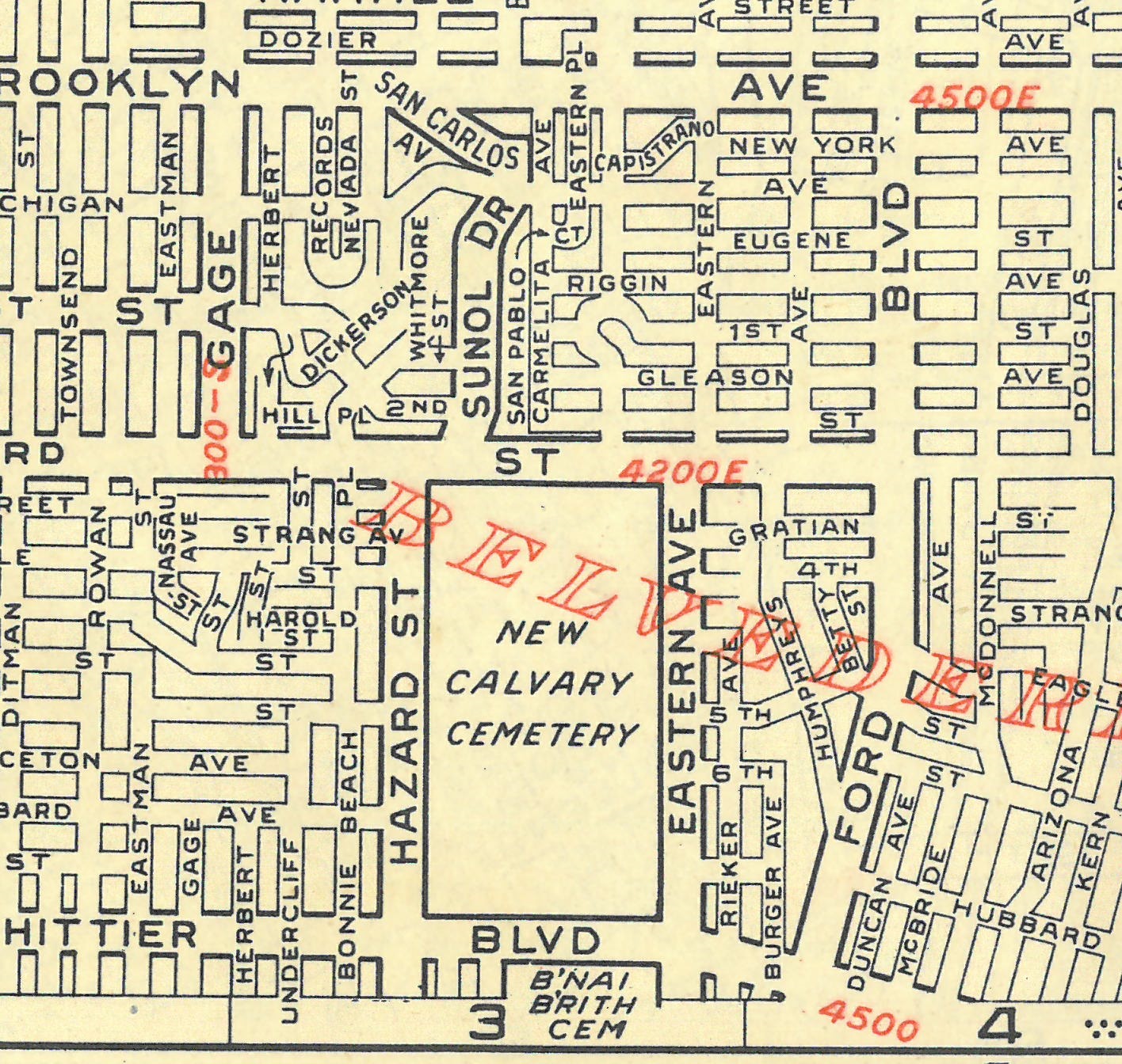 New Calvary - When Old Calvary became overcrowded many of the graves were moved out to this 137-acre spread at the edge of East Los Angeles in 1896. 1931 Gillespie guide. Barely visible at the bottom is the B'nai B’rith Jewish Cemetery that was moved from near Chavez Ravine.